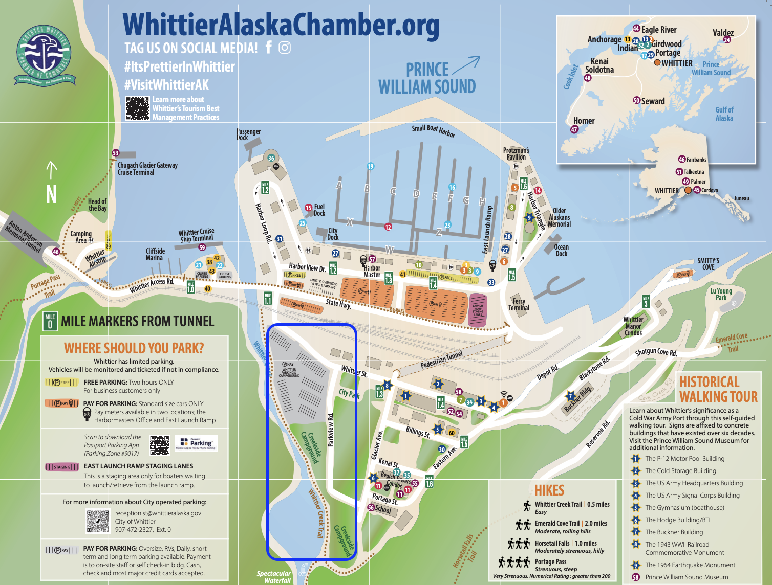 Located just off the Whittier Tunnel exit, continue on the main road and turn right after crossing the railroad tracks, just past the cruise dock. Take the next right into the driveway leading to the parking lot.